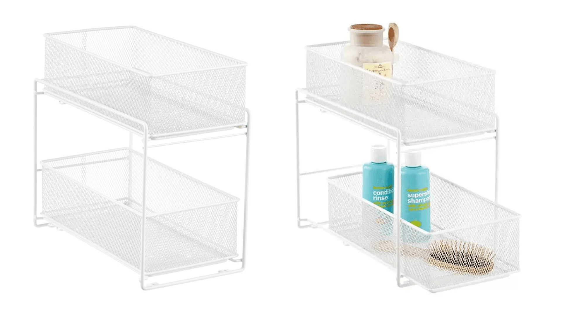 Store this under your sink and drop in all your horizontal products (i.e. brushes, flatirons, makeup palettes, etc.). Each rack slides out for easy rummaging, and the perforations prevent water and dirt buildup. They’re also perfect for toilet paper storage, holding up to four rolls each. ($29.99, The Container Store)