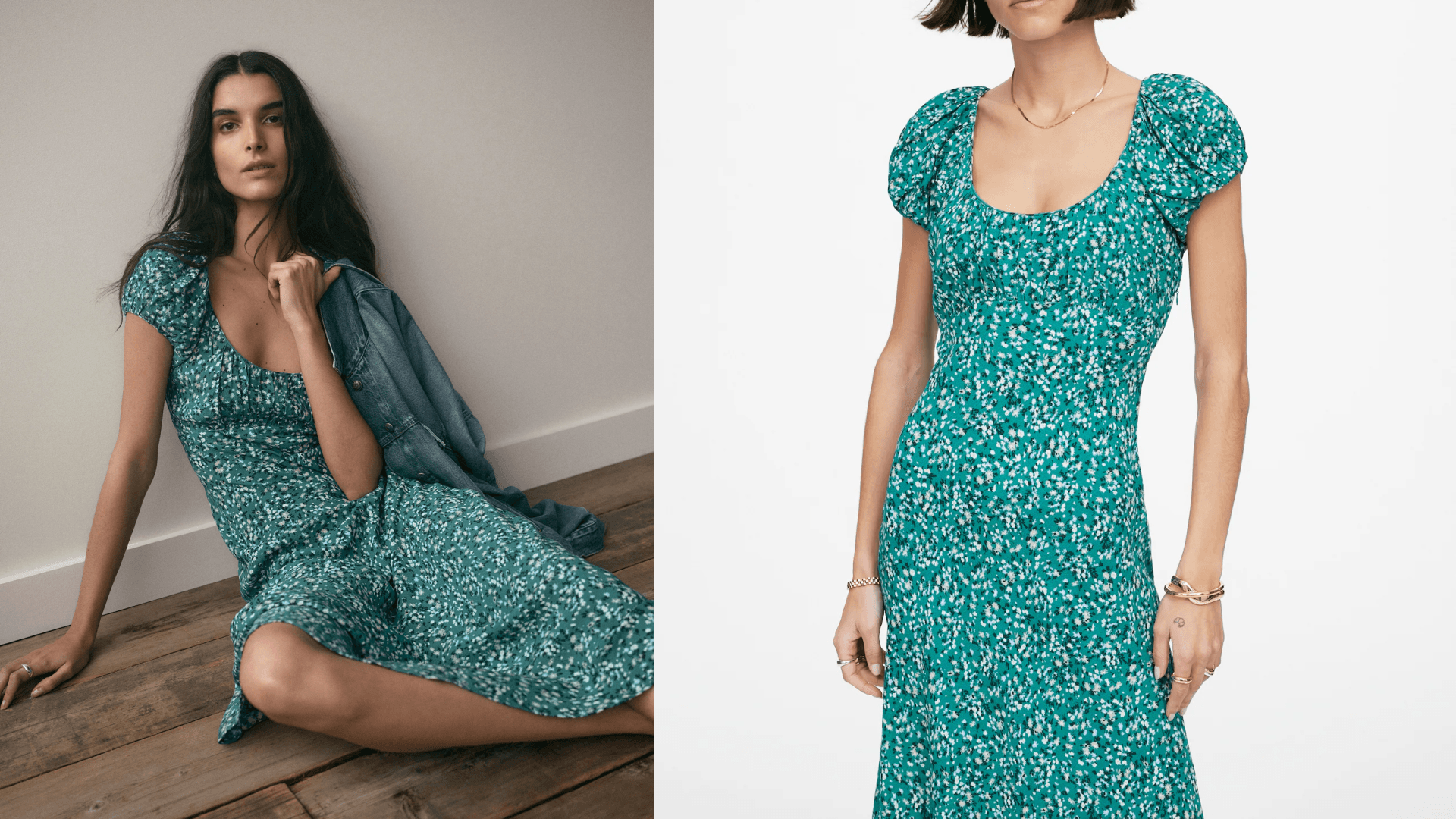 You can’t go wrong with a classic floral midi dress. This one is also aligning with this season’s green trend and has a ruched bodice for added support. Add this straw bag for a summer date night look. ($158, Madewell)
