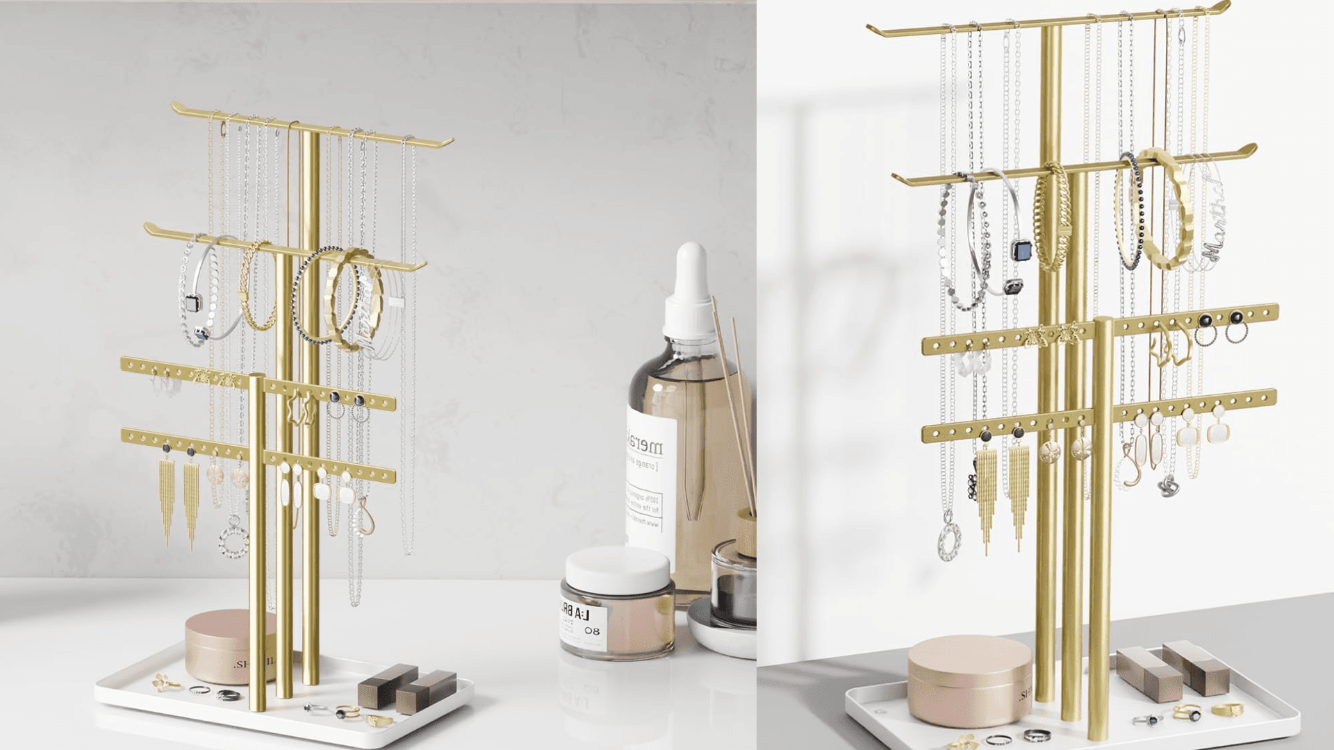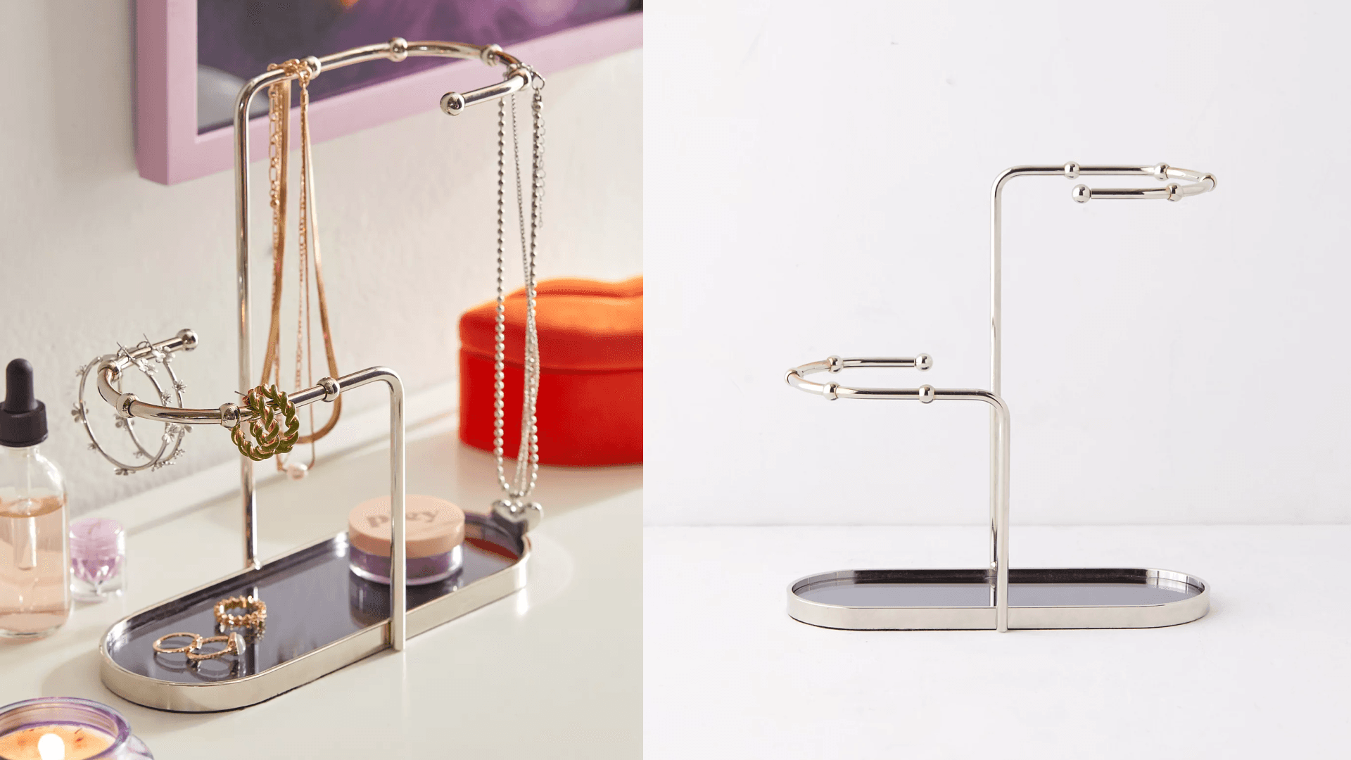 This contemporary stand is designed so well it looks like a piece of artwork. It has room for you to drape your bracelets and necklaces, along with a catchall tray at the bottom for earrings and rings. This would also be great for a smaller space because the catchall tray can also be a hub for skincare, makeup, or even perfumes. ($39, Urban Outfitters)