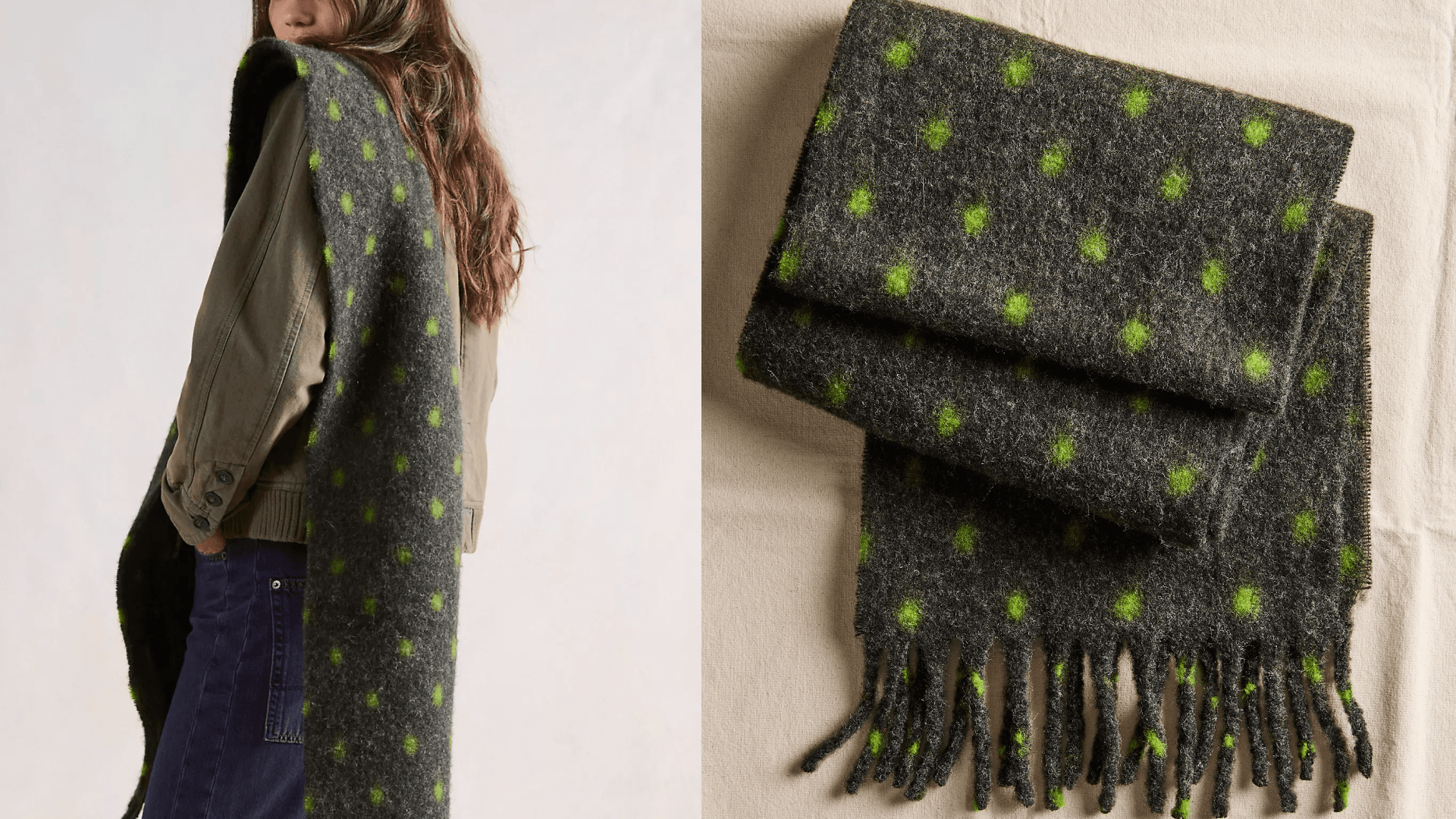 My go-to uniform is a pair of jeans, a tee, and a sweater layered on top. And while I love how I feel every time I wear that outfit formula, I like to turn to accessories to change it up. This fluffy, chunky scarf from Damson Madder provides some extra warmth, while the green printed detailing adds some interest. The shade of green will also carry me into a chillier spring. I’m also into this striped triangle scarf for warmer climates. ($88, Free People)