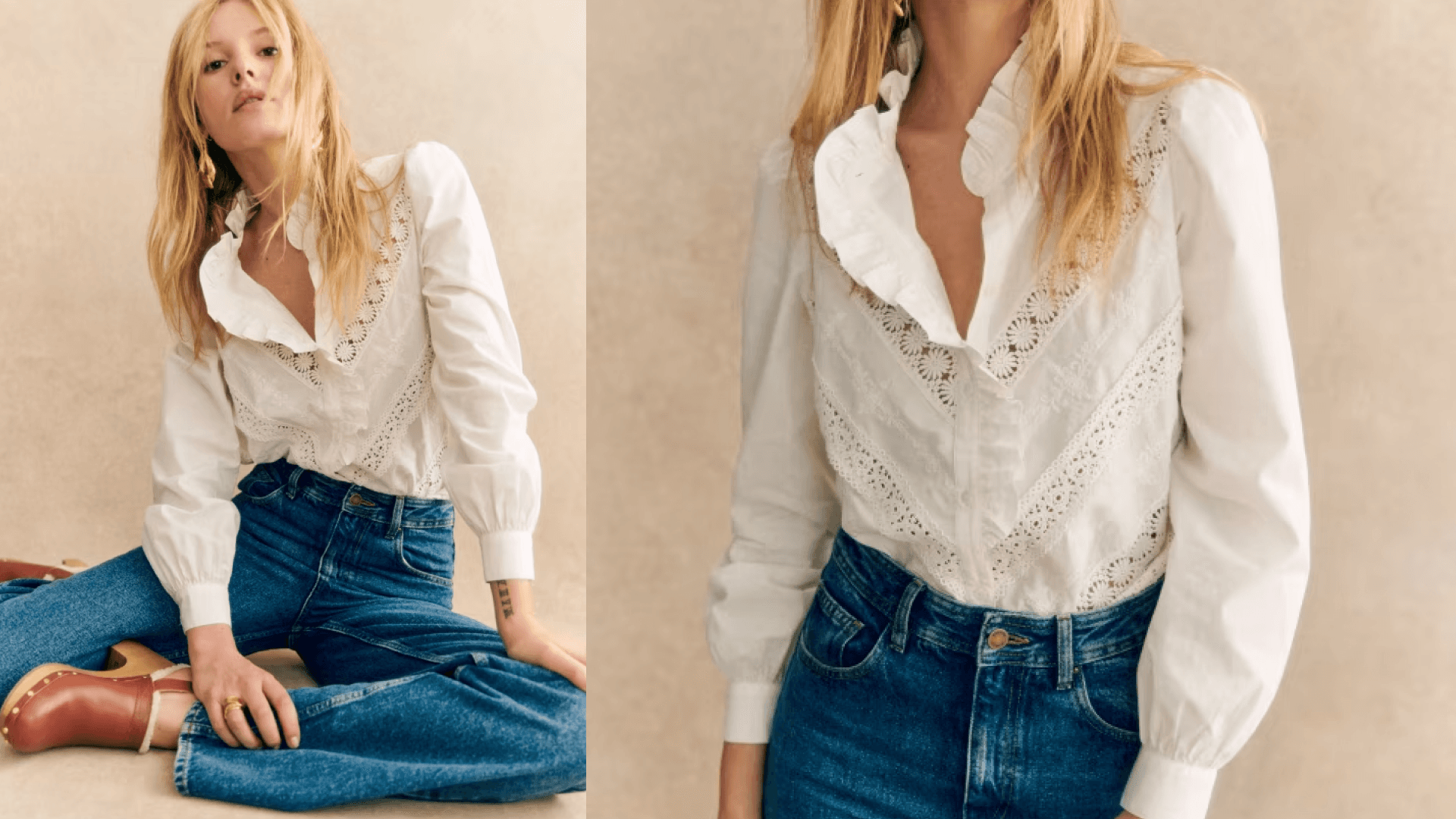 For an interview, you can never go wrong with a white button-down. This one from Sezane is on the pricier side, but it’ll last you for years to come. It has mother-of-pearl buttons, embroidered detailing, and a ruffled neckline. We love wearing statement tops to interviews because it’s one piece that does all the hard work for you. ($125, Sezane)